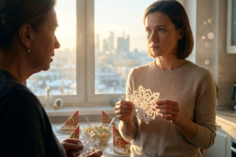 Она стояла на кухне с бумажной снежинкой в руках, и воздух звенел от предпраздничного напряжения.