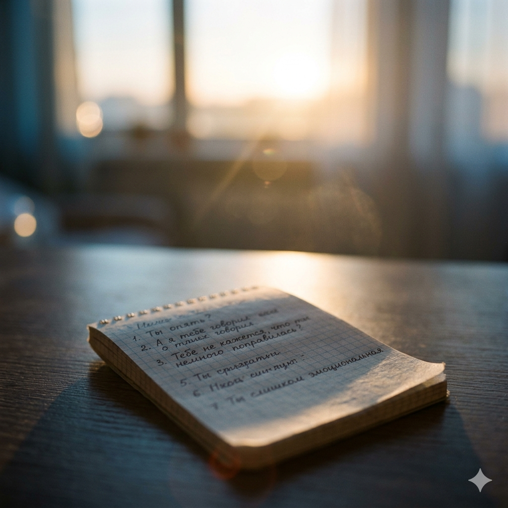 Идея с блокнотом родилась случайно. Психолог, к которому я начала ходить два месяца назад, сказала: «Татьяна, попробуйте записать, что именно вас ранит. Не эмоции — а конкретные слова. Когда увидите их на бумаге, станет яснее».