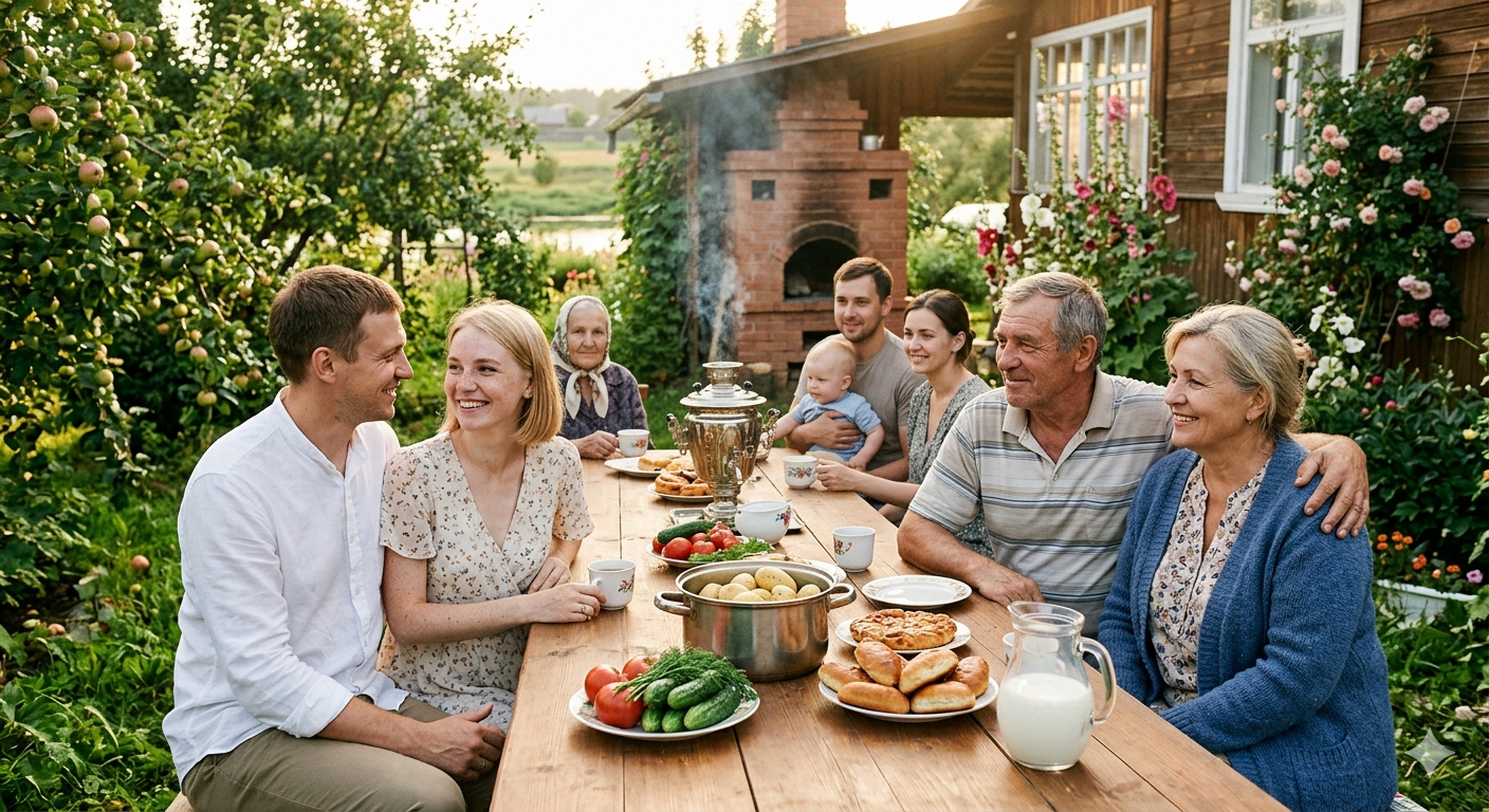 Они замолчали, дошли до реки, а потом вернулись к дому. Женщины в саду накрывали чай прямо под яблонями на деревянном столе. Самовар кипел тут же, у бани, шумя и пуская дымок, пахнущий смолой.