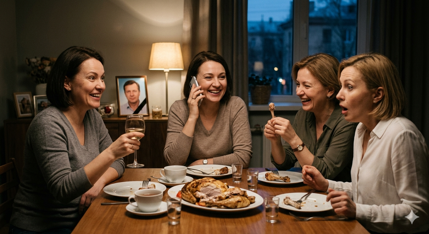 Подруги пришли ближе к вечеру, одетые в обычную красивую одежду. Да и сама вдова была не в трауре. Если что-то и говорило, по поводу, какого события они собрались, то фотография её мужа, умершего год назад.