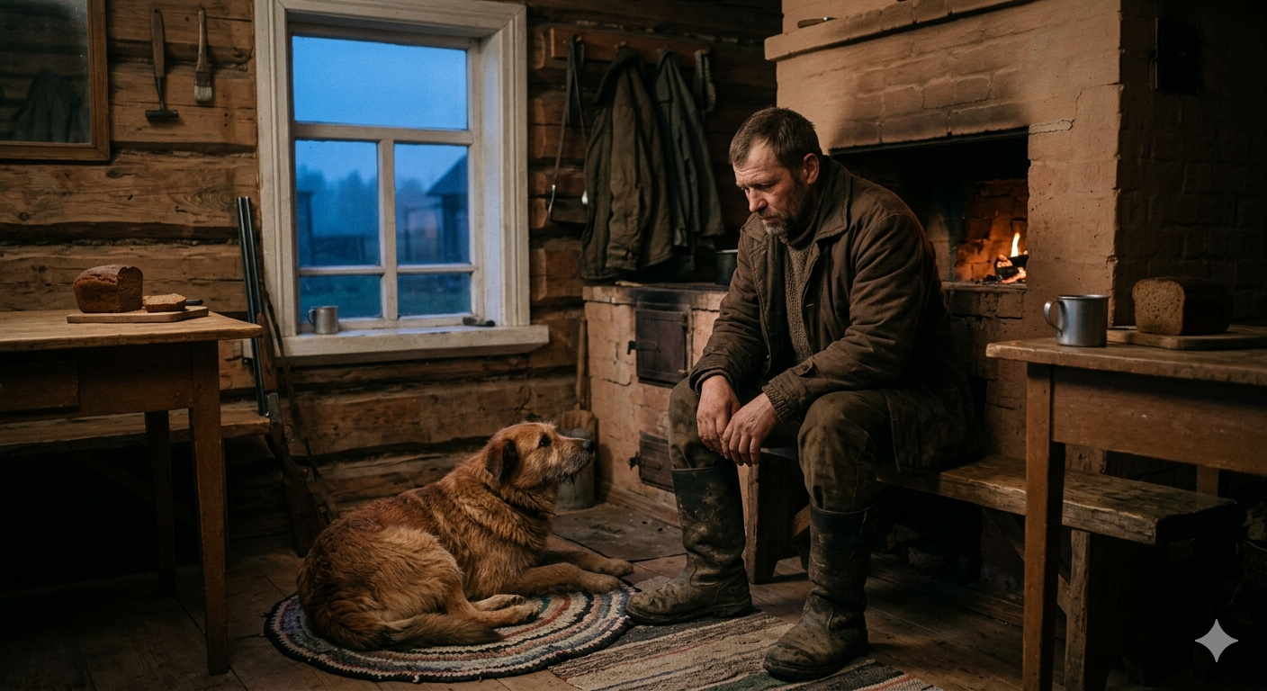 Матвея в доме не было. Только Рой лежал у порога и смотрел на неё с терпеливым достоинством сторожа, отработавшего ночную смену. На столе стоял хлеб — краюха, отрезанная от круглого деревенского каравая. Рядом — кружка молока, уже остывшего, со слабым запахом погреба, и листок бумаги, придавленный солонкой.