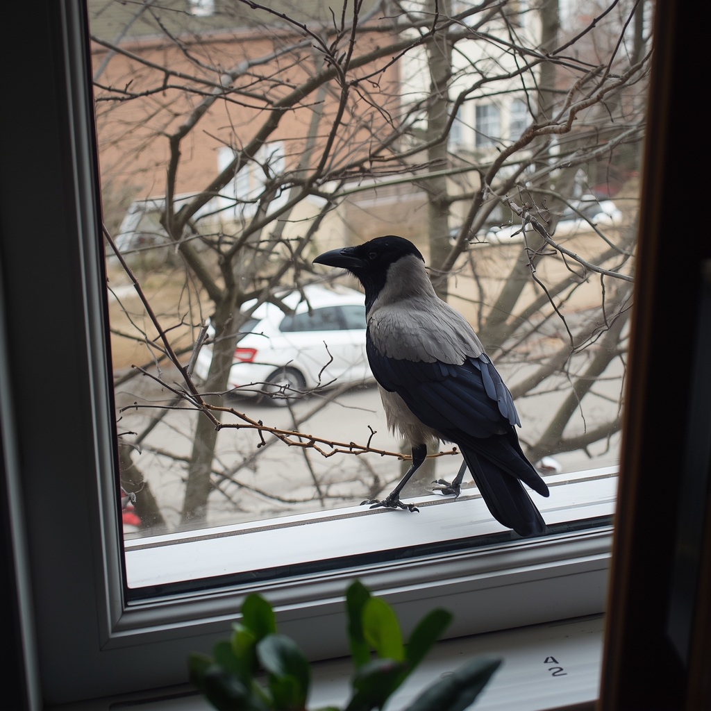 На ночь ворон улетел куда-то, а утром вернулся. Постучал клювом в окно, вошел в квартиру, проверил свою Клару и позавтракал.