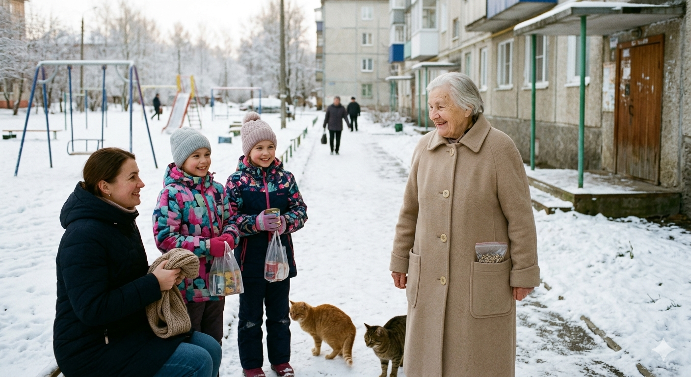 — Всё-таки и она кошек подкармливала… Хоть и не каждый день, но всё-таки помогала. А теперь уехала. Тяжелее мне будет… — сокрушалась баба Даша, рассказывая новосёлам-девочкам о своих подопечных.