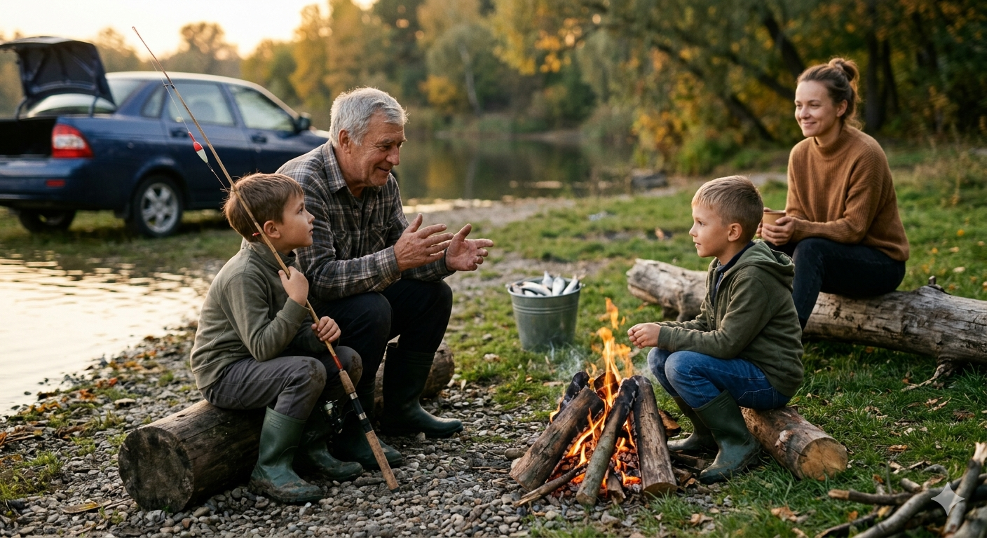 — Мам, я даже не знал, что такая бывает вкусная уха на костре, — прыгал он вокруг деда.