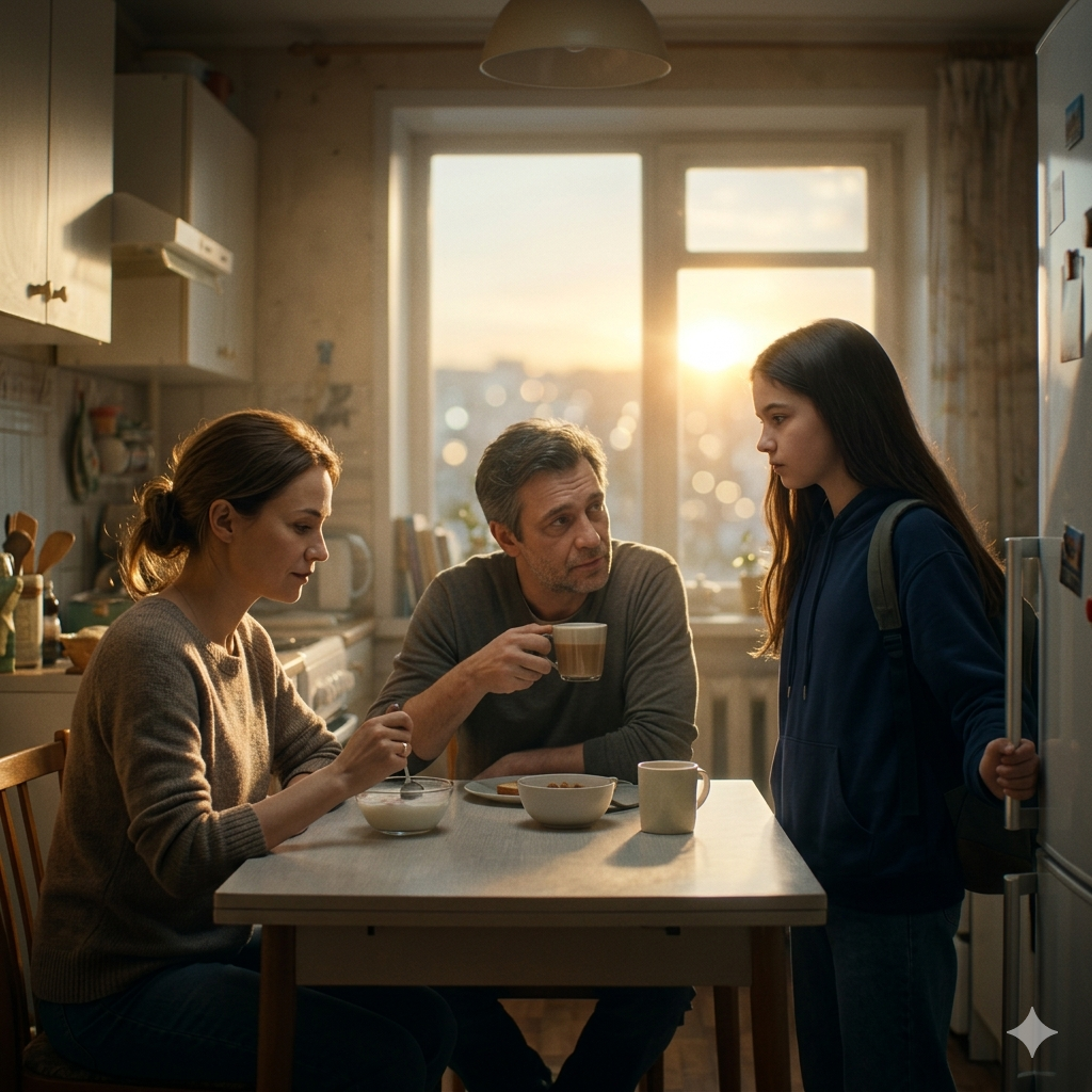 Тишина. Егор замер с бокалом на полпути. Я — с вилкой. Алиса подняла глаза и посмотрела на меня — не злобно, а с тем выражением подростка, которому велели задать вопрос, и она задала.
