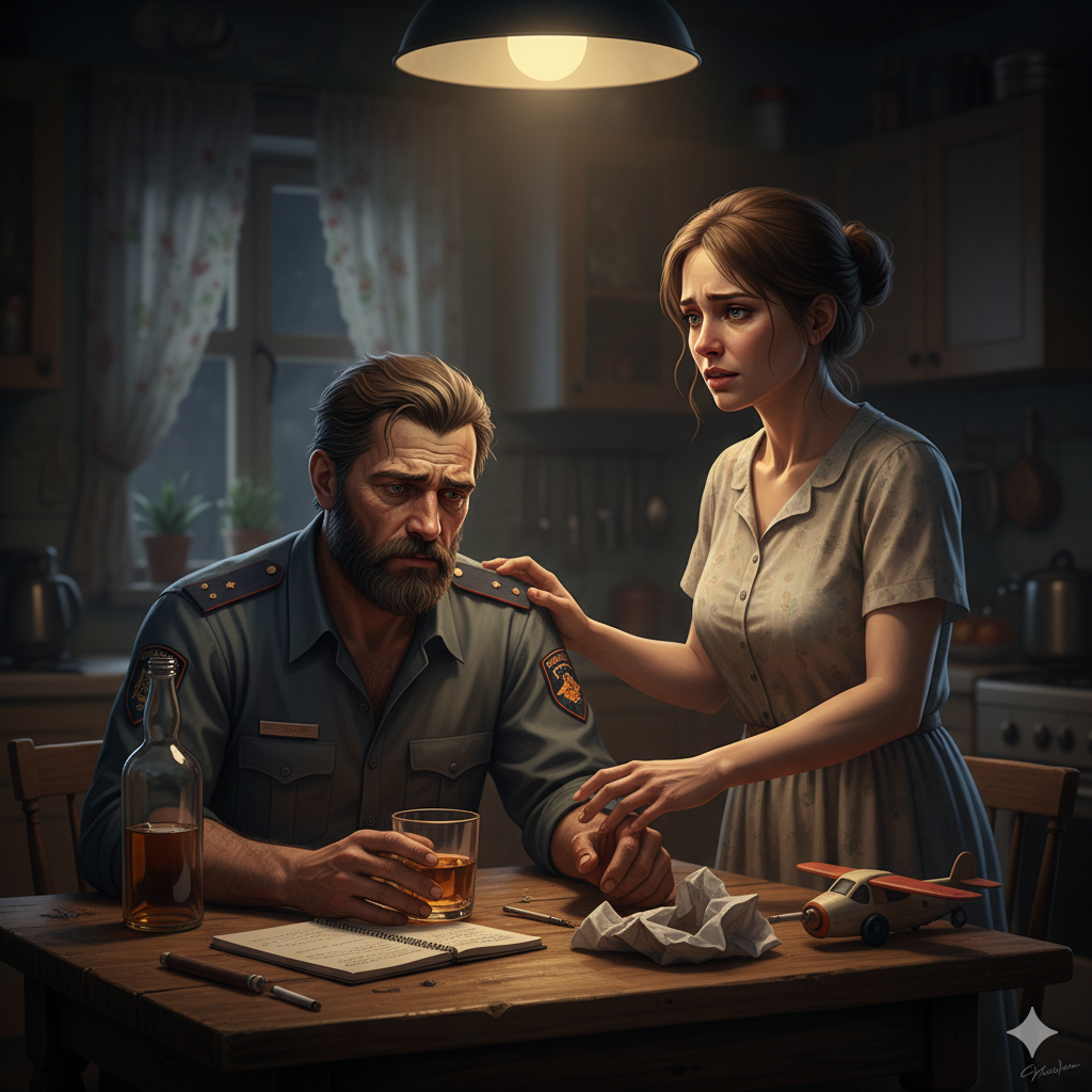 Сергей сидел за столом, опустив голову. В тусклом свете кухонной лампы его плечи казались непривычно поникшими, а обычно живые глаза теперь смотрели куда‑то в пустоту. Увидев жену, он попытался улыбнуться, но улыбка получилась вымученной, будто он натягивал её на лицо через силу.