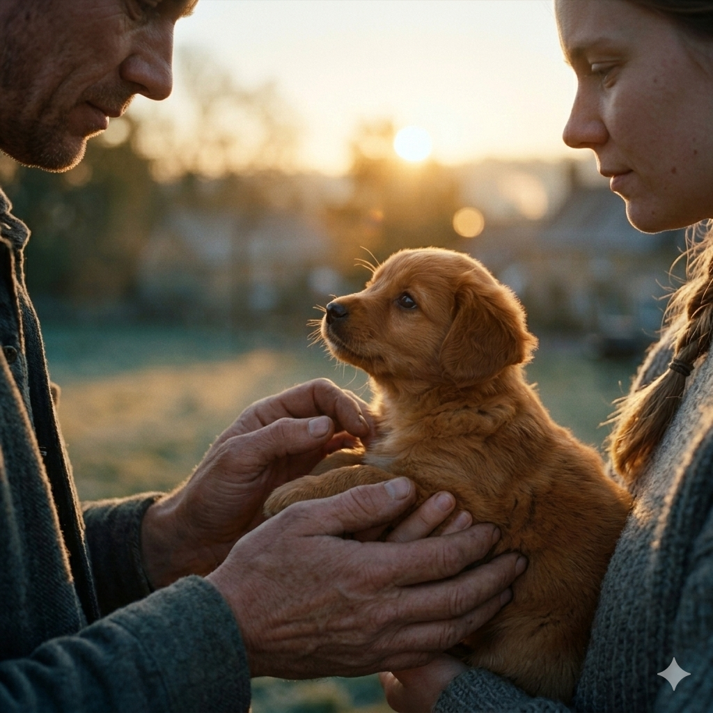 Он наклонился, подхватил щенка своими большими ладонями и бережно, словно самую драгоценную вещь в мире, протянул ей.