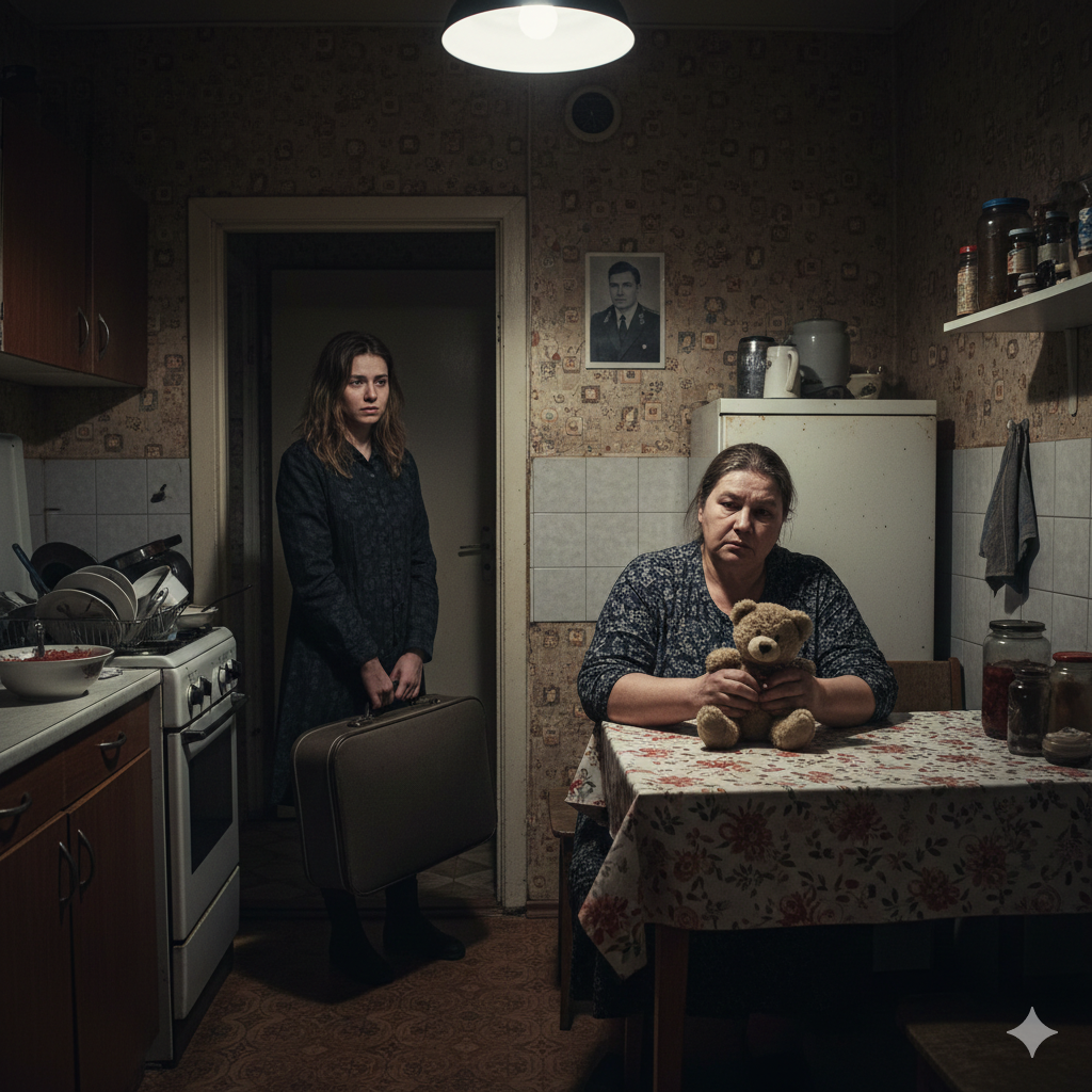 Лариса осталась одна в гулкой тишине квартиры. Она встала, подошла к окну и посмотрела вниз, на удаляющуюся фигурку дочери с большой сумкой. Потом медленно прошла в Анину комнату. Пустой шкаф. Разворошенный стол. На кровати сиротливо лежал забытый плюшевый медведь.