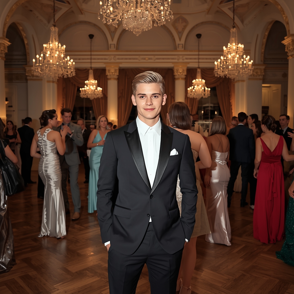 Но внимание подруг сразу привлёк центр зала. Там, окружённый стайкой девушек, стоял высокий, подтянутый парень. Он выглядел так уверенно, что сразу бросался в глаза. Одет он был стильно: тёмно‑синий пиджак сидел идеально, джинсы подчёркивали стройные ноги, волосы аккуратно уложены, на лице – лёгкая усмешка, будто он прекрасно понимал, какое впечатление производит. Девушки буквально вились вокруг него: одна поправляла ему лацкан пиджака, другая заливисто смеялась над какой‑то фразой, третья пыталась поймать его взгляд и что‑то шептала на ухо.
