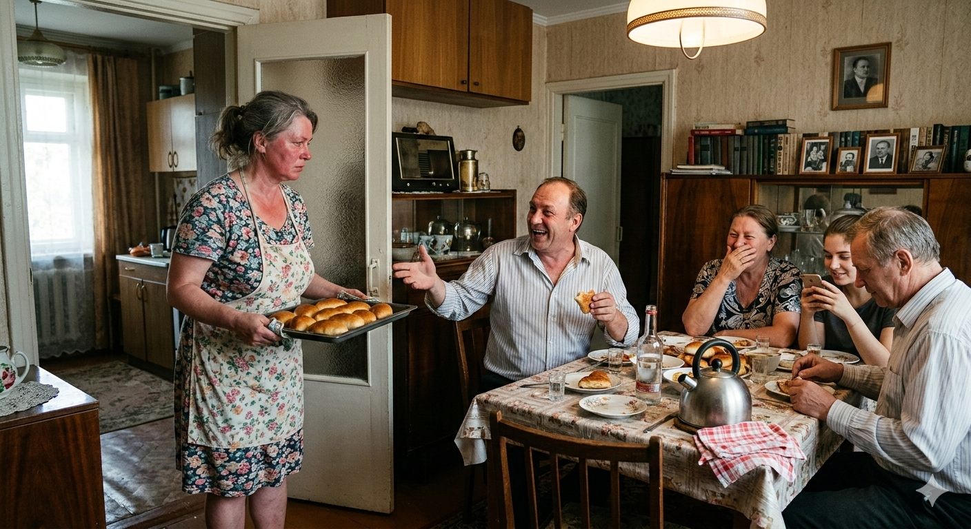 Мария поставила поднос на стол. Руки дрожали, но она старалась этого не показывать. Пирожки получились ровные, румяные — она встала сегодня в шесть утра, чтобы всё успеть. Вымыла полы, перегладила скатерть, которую Генка вчера облил вином. А он даже спасибо не сказал.