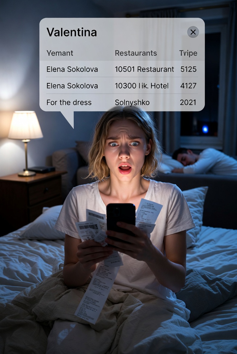 Вечером, когда Геннадий заснул перед телевизором, Валентина достала его куртку из прихожей. В карманах нашла чеки. Ресторан «Прага» — четыре тысячи рублей. Ювелирный салон — восемьдесят тысяч. Гостиница «Турист» — три с половиной тысячи.