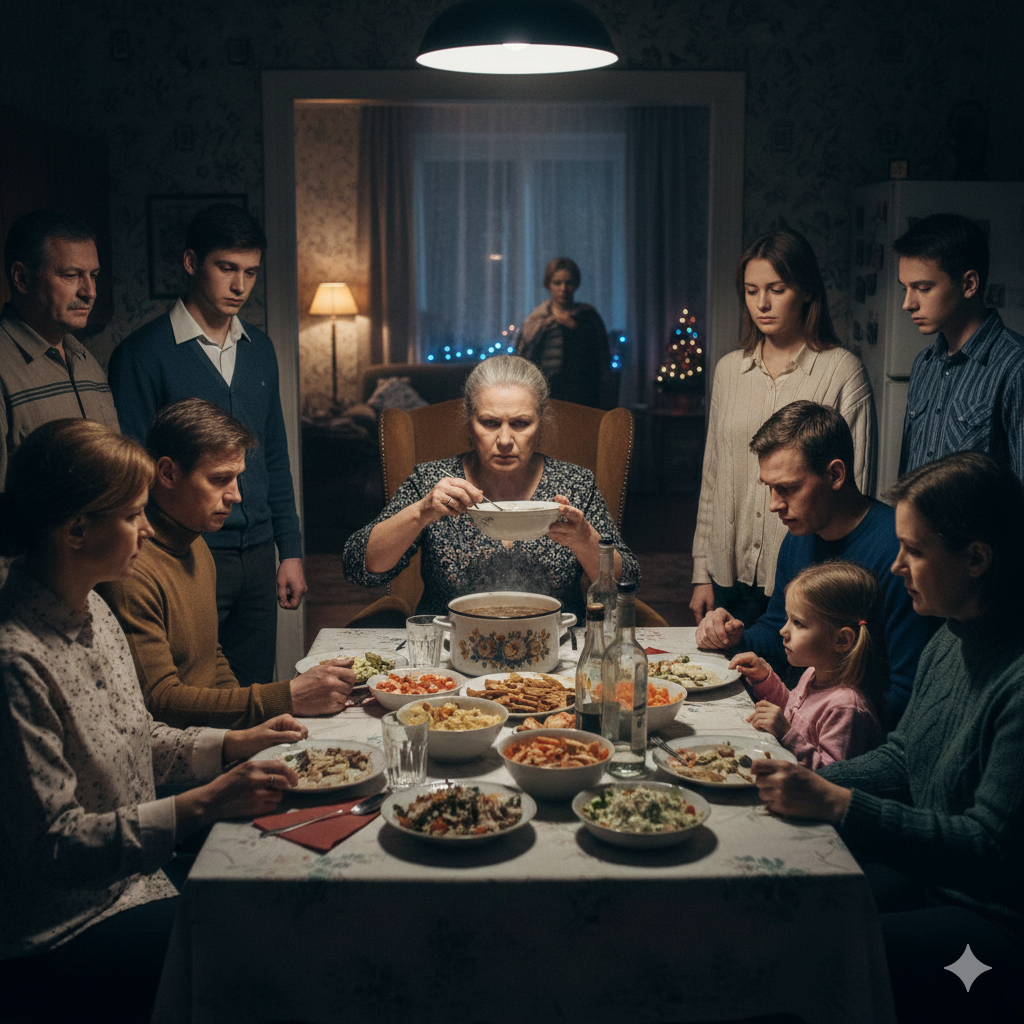 — Ты нарушаешь традицию! — громко сказала Галина Петровна. Её лицо побелело., Если супа не будет за столом, весь год будет несчастным!