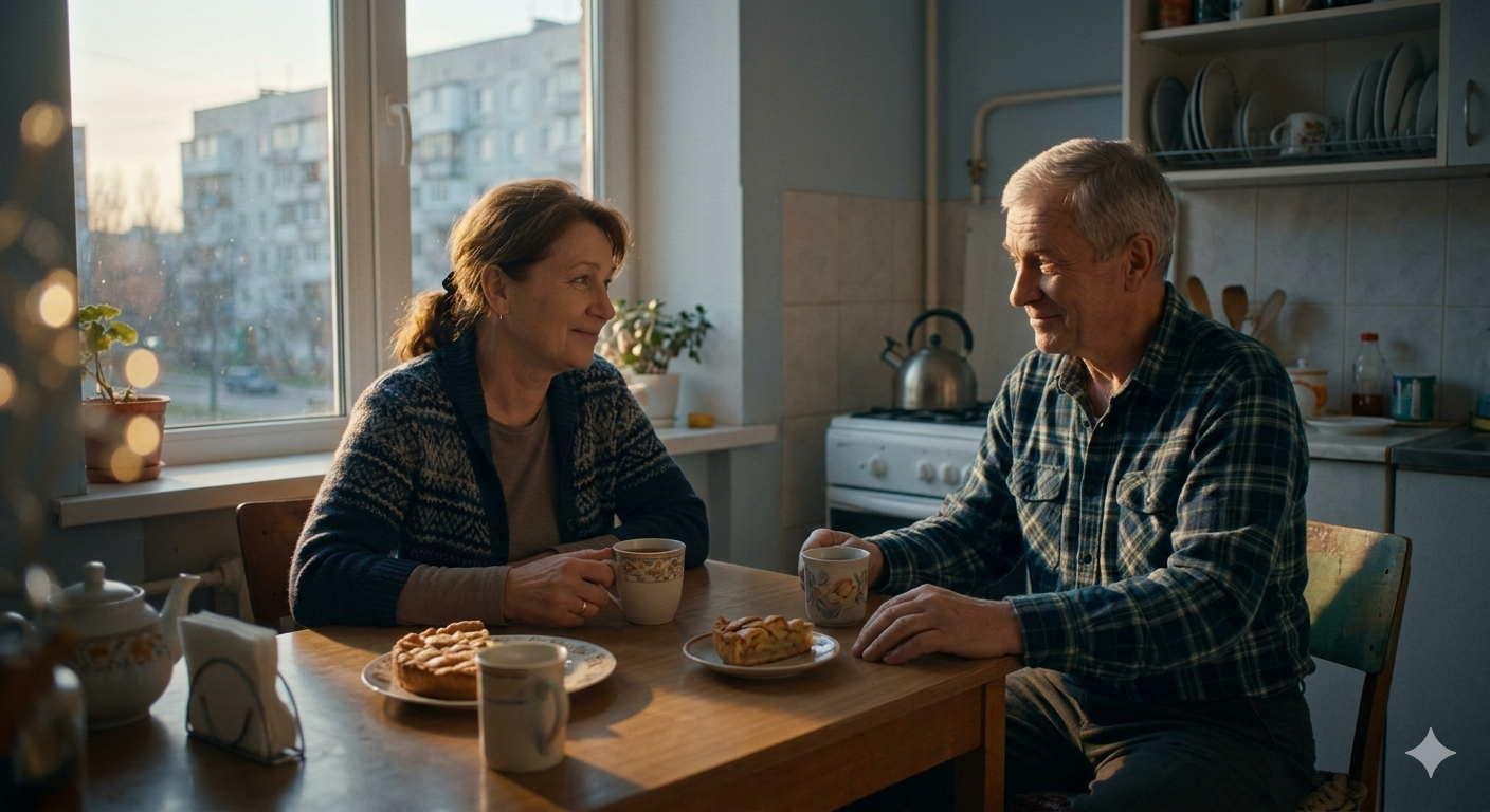Мы сидели на его кухне, пили чай с пирогом. Он рассказывал про жену, про детей, про свою работу инженером. Я слушала, иногда вставляя своё. Это было приятно. Это было по-человечески.