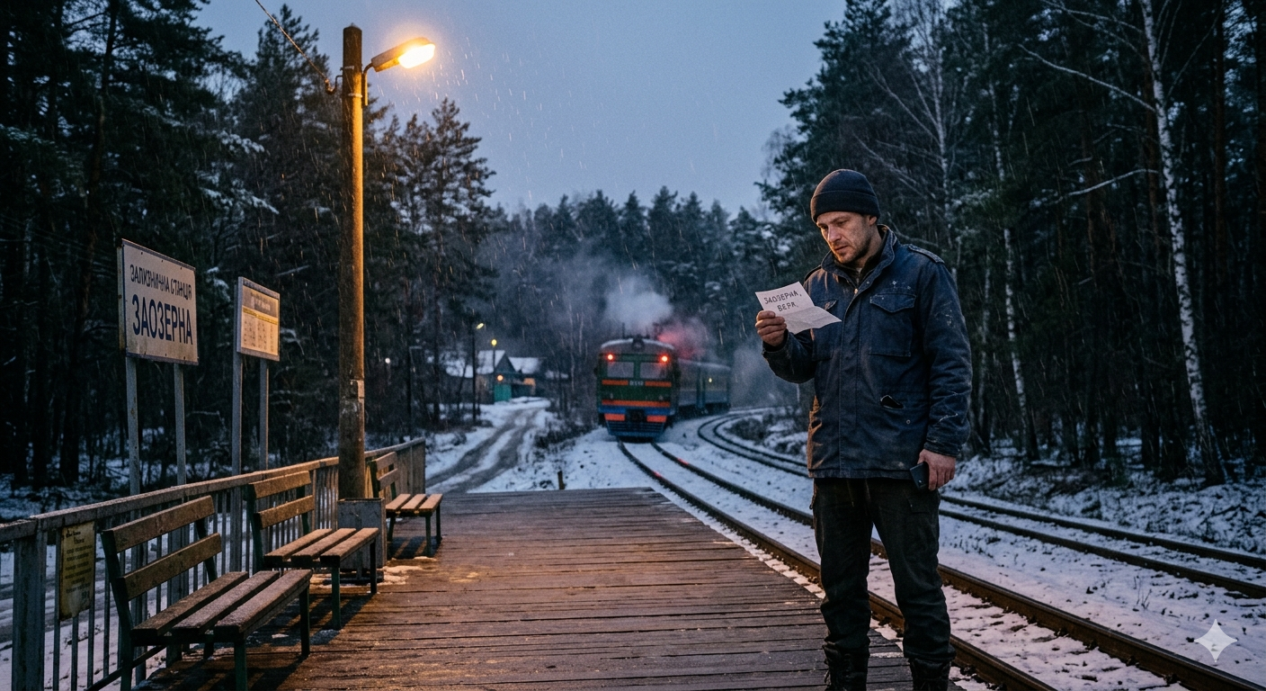 Электричка пахла нагретым пластиком и немного чьей-то едой из пакета, которую ел мужчина через два ряда. Вагон был полупустой. Андрей сел у окна, положил руки на колени и смотрел, как за стеклом меняется картинка. Сначала шли городские улицы — дома, заборы, гаражи, провода. Потом дома стали реже. Появились поля, присыпанные тонким слоем снега — недостаточным, чтобы называться зимой, достаточным, чтобы сделать всё одинаково белым. Потом начался лес. Колёса стучали по рельсам мерно, с небольшим синкопом на каждом стыке. За окном деревья двигались мимо — тёмные стволы, серое небо между ветками. Андрей смотрел на всё это и думал, что не может вспомнить, когда последний раз видел лес. Наверное, давно. Голова была тихой, неспокойной. Именно тихой — как бывает после очень долгого шума, когда шум наконец прекращается и остаётся только звон. Он не думал о том, что его ждёт в деревне Заозёрной. Не думал о том, что скажет старухе, которую видел один раз в больничной палате три месяца назад. Не строил планов и не придумывал объяснений. Он просто ехал, потому что на диване больше не получалось, потому что бумажка оказалась сухой, потому что иногда последний шаг — это единственный шаг, который ещё остался.