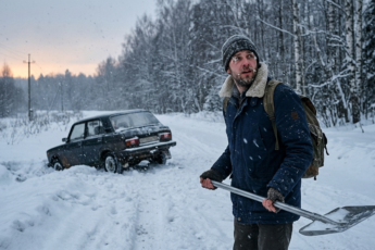 Снег валил из небесных глубин хлопьями. Притоптывая ногами, с лопатой в руках, он ходил возле машины.