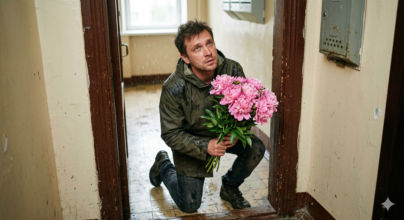 И вот он стоит. Куртка потемнела от дождя. Вдруг — резкое движение, и он уже на одном колене на грязном полу. Эффектная поза, взгляд снизу вверх, букет как щит. Выглядело бы красиво, если бы не было так тошно.