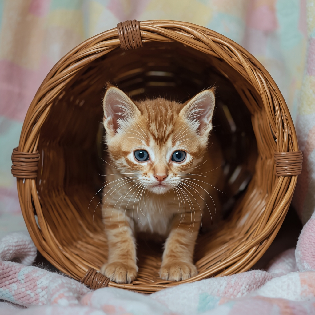 Котенок тем временем занервничал в корзине. Видимо, запасу его терпения пришёл конец. И он, отчаянно барахтаясь, стал пытаться вылезти на свободу.