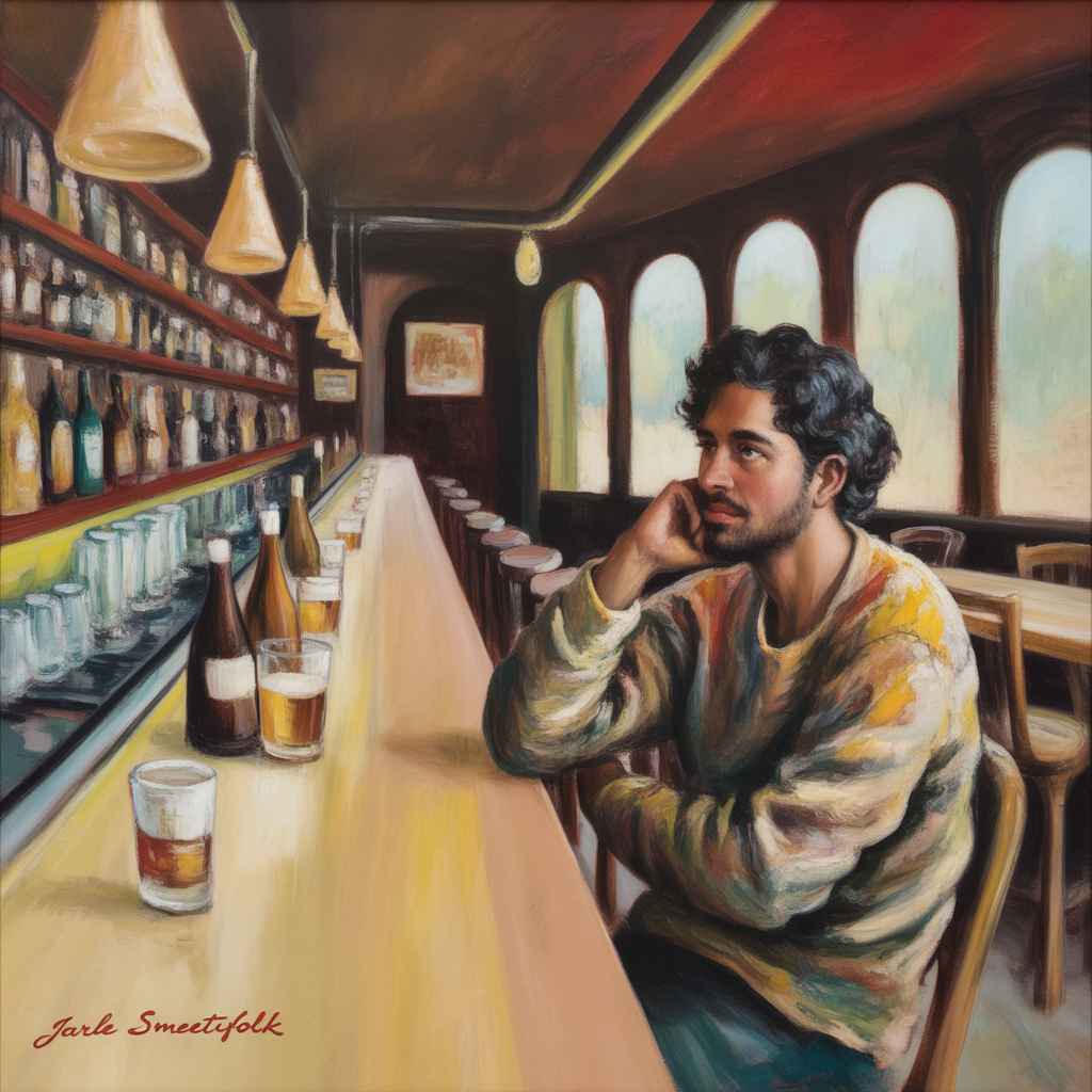 Бар почти опустел, лишь высокий широкоплечий мужчина сидел у дальнего конца барной стойки, угрюмо нависая над опустевшим графином. Бармен – молодой черноволосый парнишка в ядовито-лимонном жилете с блестками, протирая и без того сверкающую стойку, приблизился к позднему посетителю.