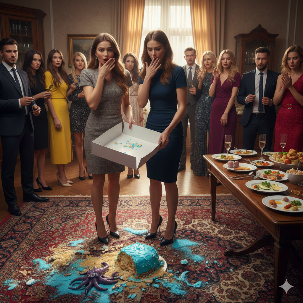 Торт приземлился на ковер «лицом» вниз. Синие волны перемешались с кремом, карамельные дельфины разлетелись на мелкие осколки, а осьминог, тот самый, над которым Кристина сидела два часа, превратился в бесформенную лиловую лепешку.