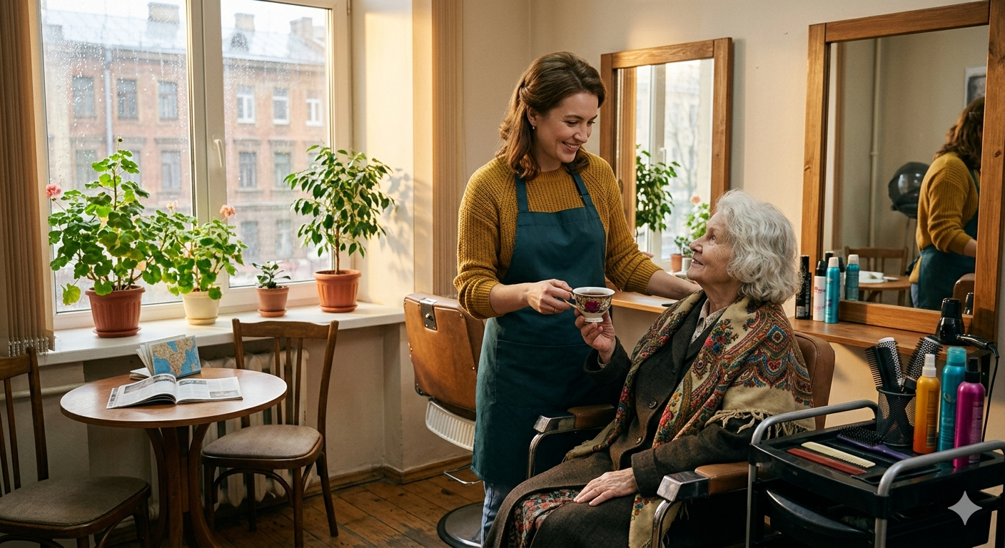 Она взмахом руки позвала старушку в парикмахерскую, и та вошла.