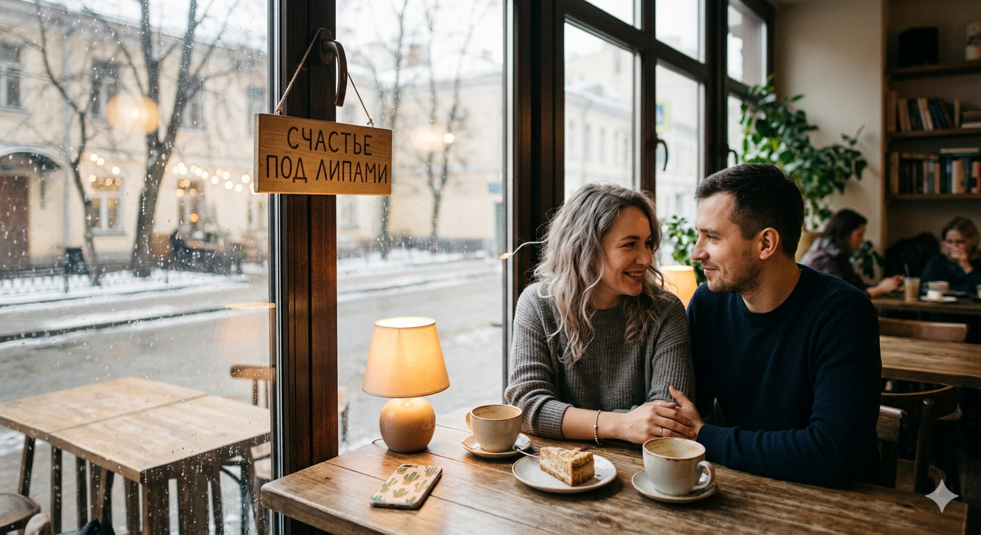 Он вышел на «Новокузнецкой» и побрёл пешком. Снег хрустел под ногами. Дома здесь были старыми, двухэтажными, с резными наличниками. Кофейня «Счастье под липами» оказалась именно такой, как на заставке: маленькая, с деревянной вывеской, тёплым светом в окнах и колокольчиком над дверью. Андрей толкнул дверь, и звон разлился в воздухе, смешиваясь с ароматом корицы и свежей выпечки.