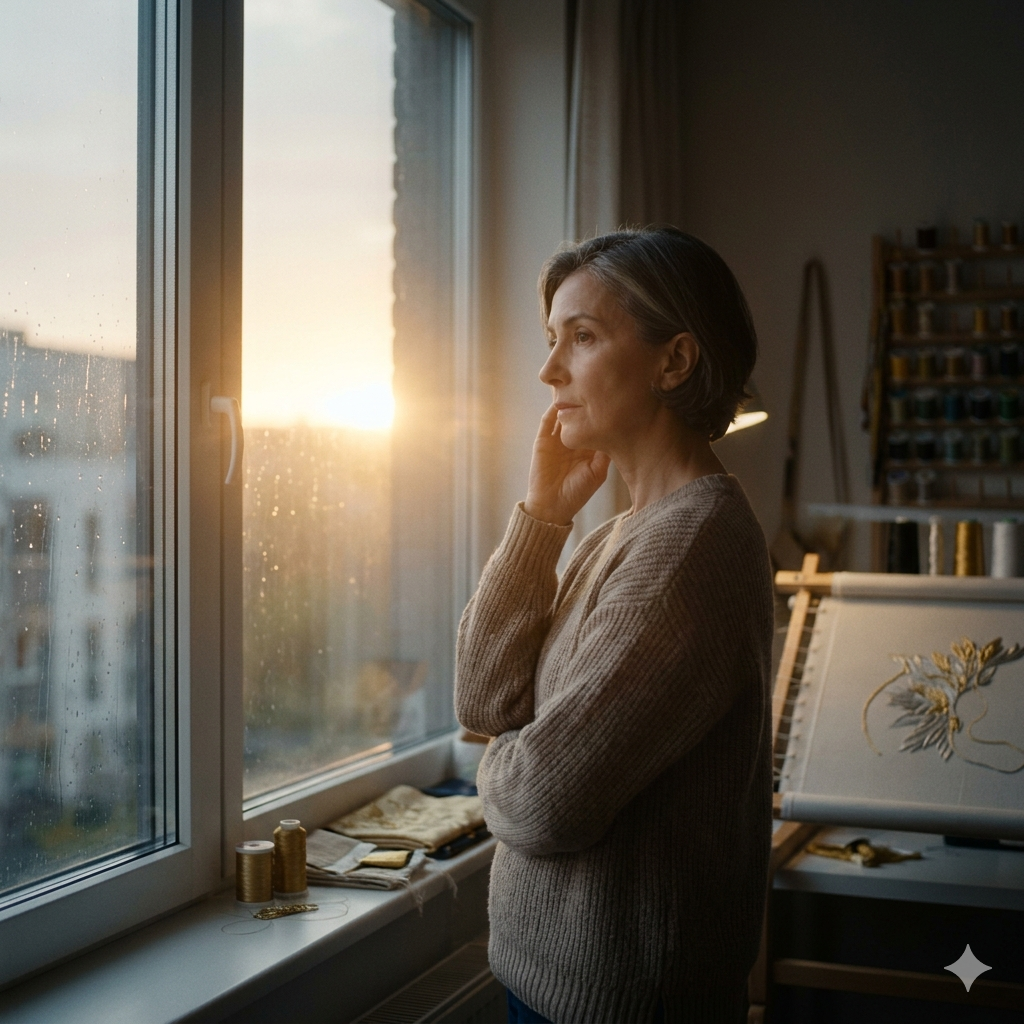 Мне пятьдесят шесть лет. Я не старуха и не молодуха, я точно посередине, в том возрасте, когда уже знаешь себе цену и при этом ещё достаточно гибкая, чтобы не ломаться от каждого ветра. Работаю я дома: беру заказы на художественную вышивку, выполняю их для частных коллекционеров и небольших галерей. Это не хобби, это деньги, и деньги не маленькие. Плюс веду онлайн-курс для тех, кто хочет научиться счётной глади и золотному шитью. Моё рабочее место, мой угол в спальне с дневным светом от северного окна, мои нитки, рамы, ткани, распечатки схем, это не просто «где я сижу». Это мой цех. Мой кормилец.