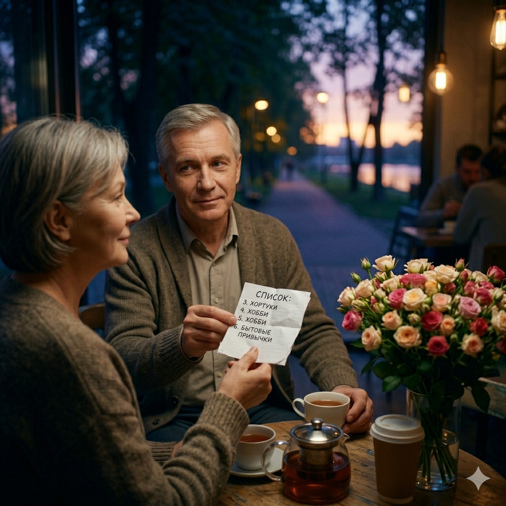 И тут до меня дошло: он не чудак и не робот. Он — мужчина, который настолько боится провалить свидание, что подготовился к нему, как к защите диплома. Потому что для инженера, который двадцать пять лет чертит детали, импровизация — это ад. А список — единственный способ не замолчать навсегда.