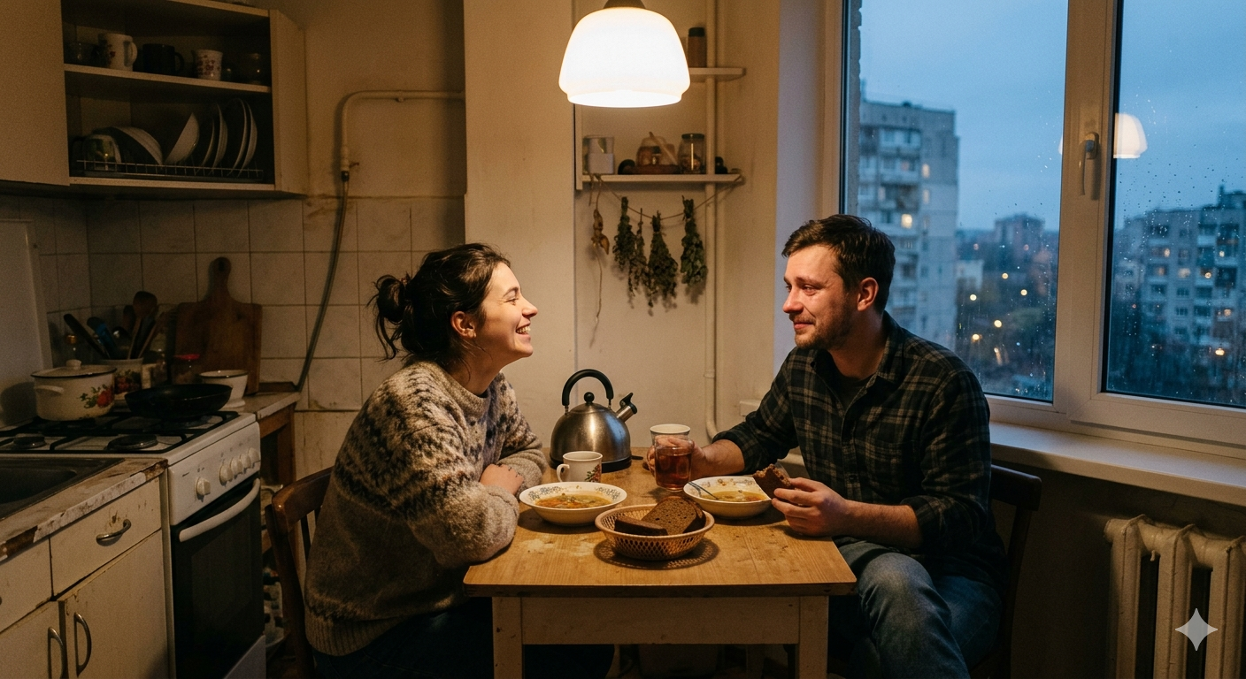 А здесь, на маленькой кухне с облезлой плитой и чёрным хлебом в старой хлебнице, кто-то наконец перестал голодать по-настоящему.