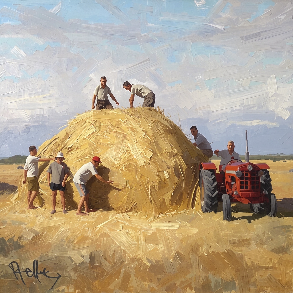 Потом, когда снопы хорошо просушивались, их свозили в большие скирды, а то и – прямо к молотилке, работавшей «с колёс». Так вот снопы