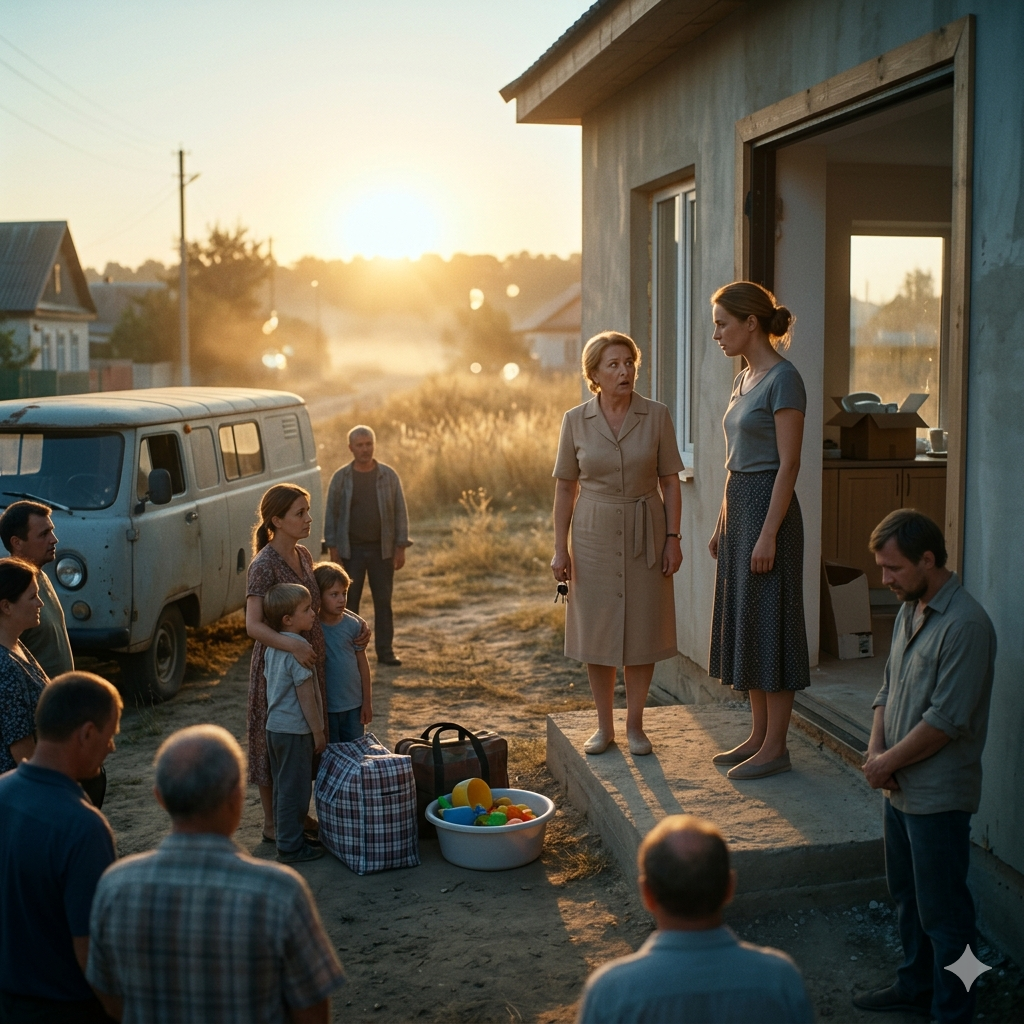 Во дворе стоял старый фургон Дениса Кравцова. У калитки толпились Светлана с двумя детьми, пакеты, клетчатая сумка, пластиковый тазик с игрушками, свекровь в своём бежевом платье и мой муж, который выглядел именно так, как выглядят мужчины, слишком долго надеявшиеся, что всё решится без них. То есть жалко и бессильно одновременно.