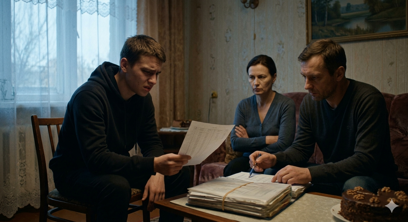 Квартира встретила его тишиной. Ни запаха выпечки, ни смеха. Родители — Игорь Анатольевич (47 лет) и Светлана Васильевна (45 лет) — сидели в гостиной на диване. Между ними на журнальном столике лежала потрепанная пластиковая папка, перетянутая резинкой.