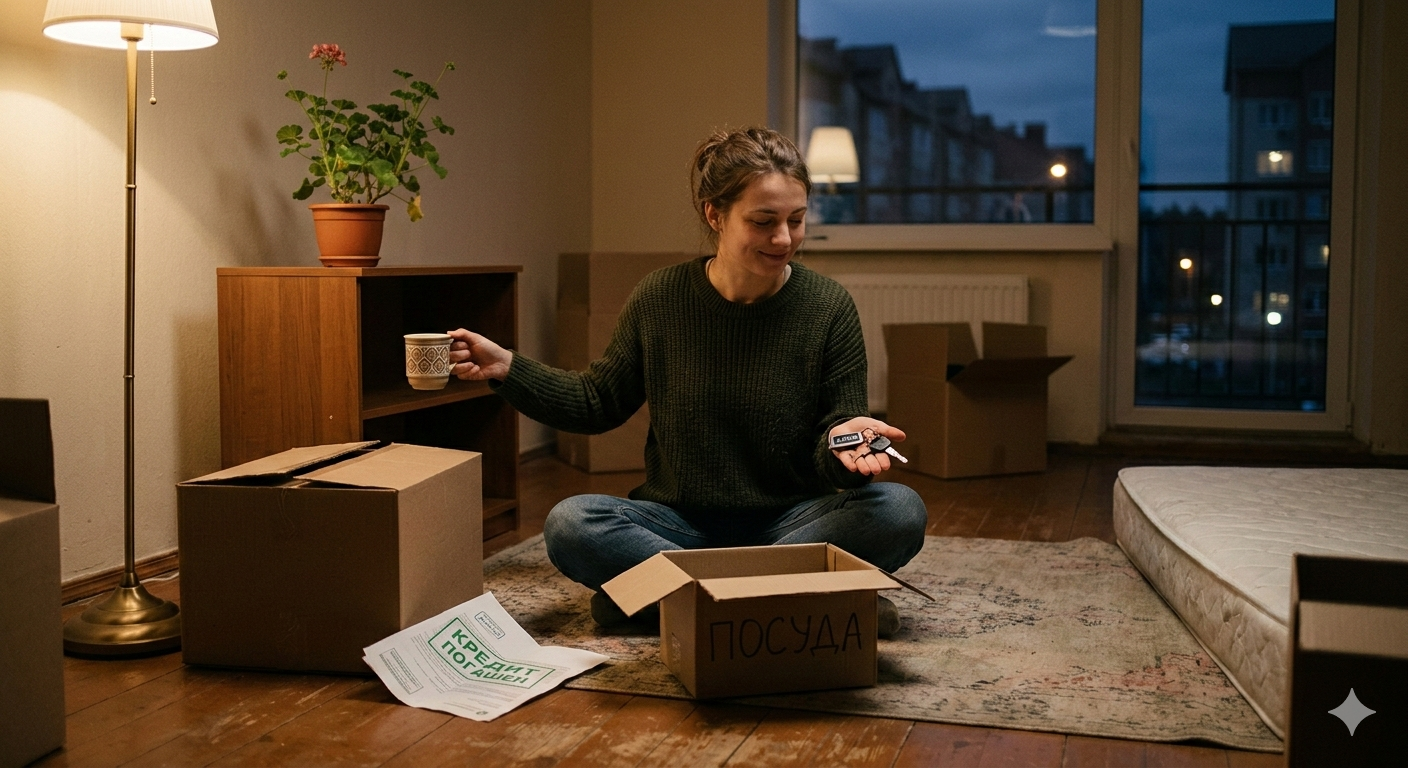 Теперь я сижу на голом полу своей новой квартиры. Рядом стоит чемодан и коробка с посудой. За окном темнеет. Где-то там ездит его новая машина, купленная в очередной кредит. А здесь — тишина. Моя.
