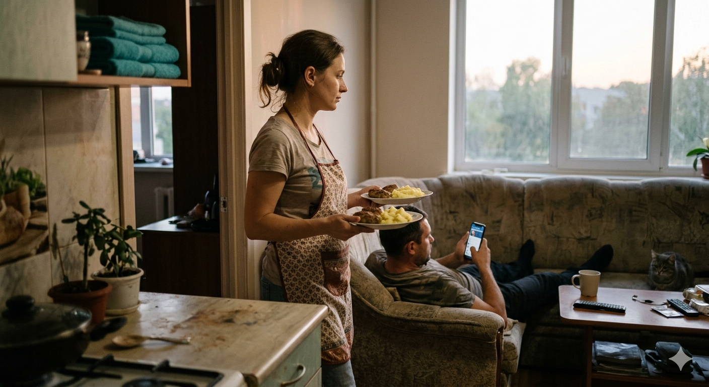 Знаете, этот момент я потом прокручивала в голове раз пятьдесят. Не скандал. Не измена. Не какой-то ужасный поступок. Просто мужик на диване с телефоном. И я — с котлетами. И эта фраза.