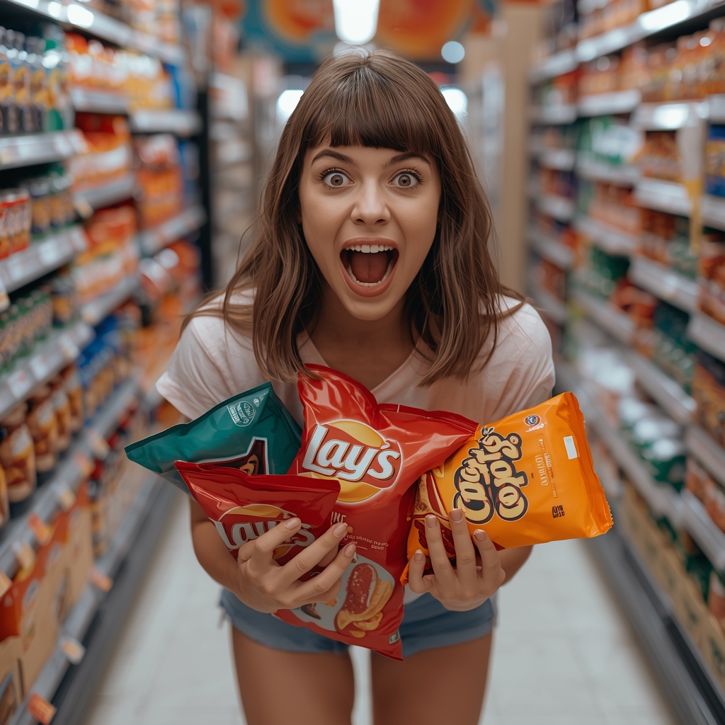 Через несколько минут её руки были заняты полностью. Пакеты, упаковки, фрукты, ветчина — всё это держалось каким-то чудом, балансируя на грани.
