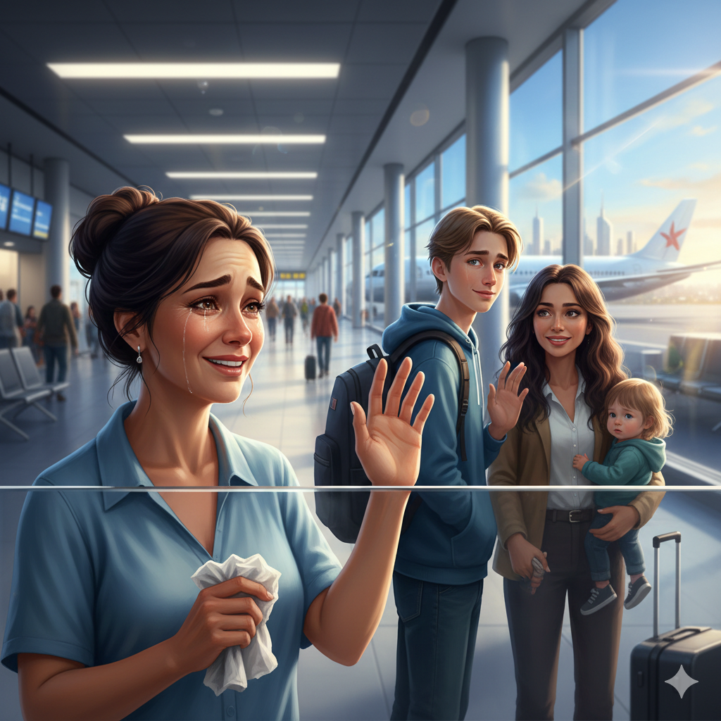 Таня стояла у выхода на посадку, нервно сжимая в руках платок. Вокруг суетились пассажиры, раздавались объявления по громкой связи, но она почти не замечала этого. Всё её внимание было сосредоточено на Лёше – парень уже почти догнал её ростом, но в этот момент выглядел совсем мальчишкой, растерянным и взволнованным.