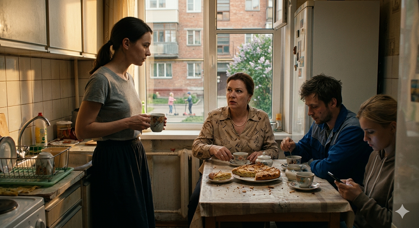 Елена стояла у раковины с мокрой чашкой в руке и несколько секунд просто смотрела на свекровь. На кухне пахло творогом, жареным луком и крепким чаем. За окном тянулся тёплый воронежский вечер, по двору катались дети на самокатах, у соседей сверху что-то тяжело двигали по полу. Самый обычный майский день. Только в этом дне вдруг стало слишком ясно, что её после свадьбы позвали не в семью. Её позвали в готовую систему, где для неё уже придумали роль.