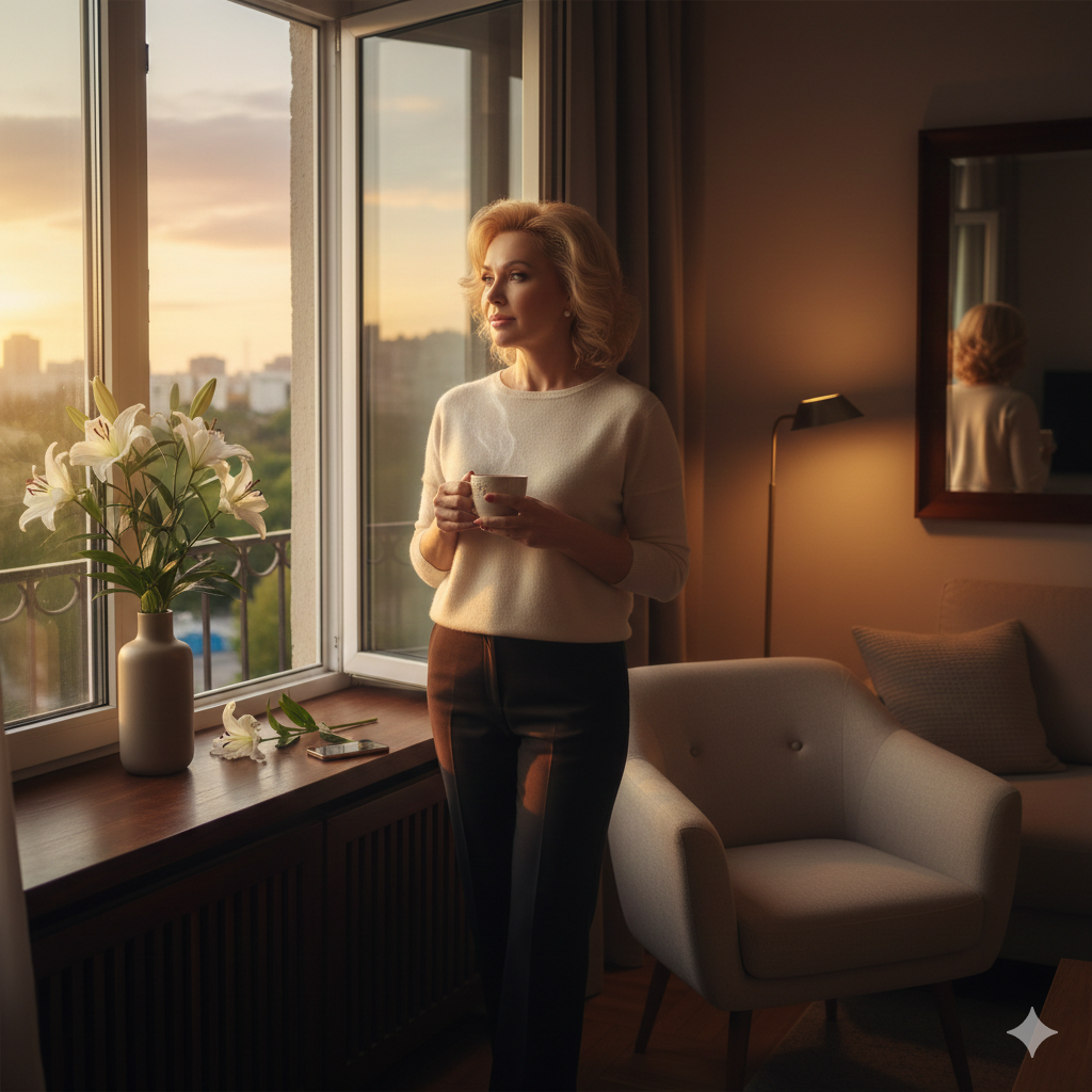 Иногда вечером, когда все уходили, она садилась в кресло у зеркала и смотрела на себя. В отражении теперь была другая женщина, не та, что годами терпела ради удобства. Лицо спокойное, глаза живые, в уголках морщинки, но не усталости, а тепла.