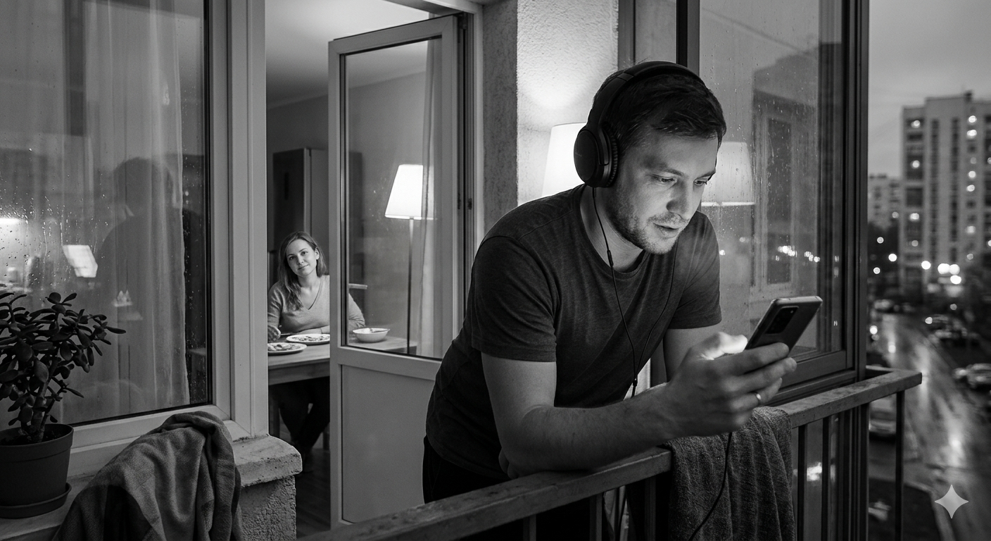 Он надел наушники и вышел на балкон. Разговор с Викой — важнее. Я — подождёт. Как всегда.